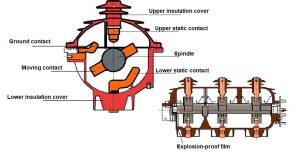 1. Tải công tắc bộ ngắt điều chỉnh gãy đôi, cấu trúc tiếp xúc di động quay, với ba loại trạng thái hoạt động sau: đóng, mở, tiếp đất.