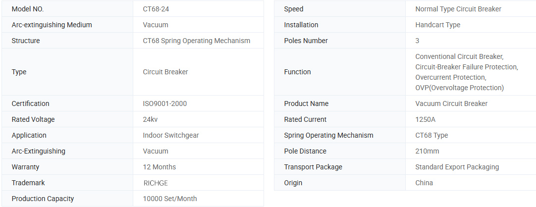 Mô hình CT68 -24 Sử dụng bộ ngắt mạch chân không trong nhà với cơ chế vận hành lò xo CT68. Đó là thiết bị Ditributing công suất trong nhà ba pha, 50 Hz với điện áp 24kV.