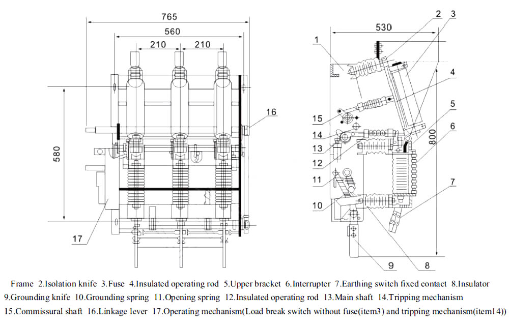 Công tắc tải trọng chân không điện áp cao FZN21-12 chủ yếu bao gồm FRAMER, công tắc ngắt kết nối (cầu chì giới hạn dòng điện của bộ kết hợp nằm trong công tắc ngắt kết nối), ống chuyển mạch chân không, công tắc nối đất, cơ chế vận hành lò xo, v.v. Sản phẩm này có cấu trúc nhỏ gọn, khối lượng nhỏ, tuổi thọ dài, khả năng đóng cửa và phá vỡ mạnh mẽ, và vận hành và bảo trì dễ dàng. Công tắc chân không được trang bị cơ chế hoạt động lò xo, áp dụng lưu trữ năng lượng lò xo động cơ điện (hướng dẫn sử dụng), và có hai loại phương pháp đóng: đóng điện và phân tách thủ công và đóng. Công tắc ngắt kết nối, công tắc chân không và công tắc tiếp đất được lồng vào nhau (lồng vào nhau cơ học) để ngăn chặn sự sai lệch.