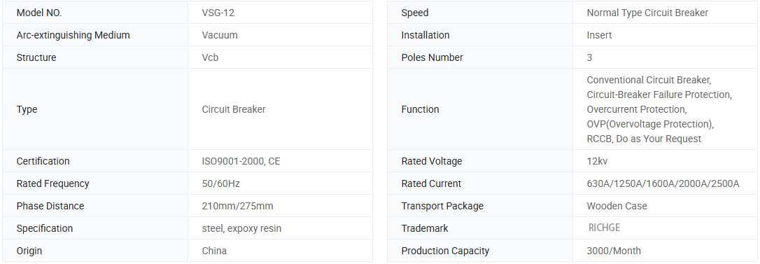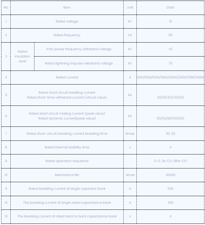 VSG-12 2000A Thông số kỹ thuật của bộ ngắt mạch chân không